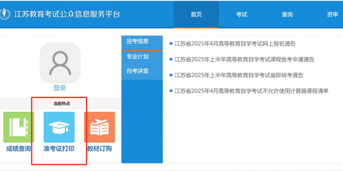 打印入口:登录江苏省教育考试院网站(https://www.jseea.cn)“招考业务”栏目“自学考试”页面打印本人准考证。