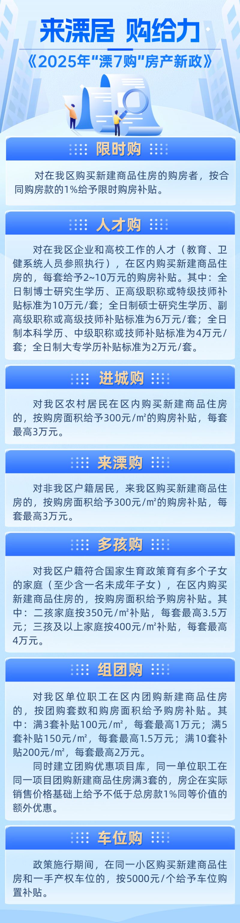 6.“人才购”“进城购”“来溧购”“多孩购”补贴不可兼享;“限时购”“组团购”和“车位购”可与其他补贴叠加享受;“人才购”与《溧水区人才安居办法》中购房补贴不可同时享受。