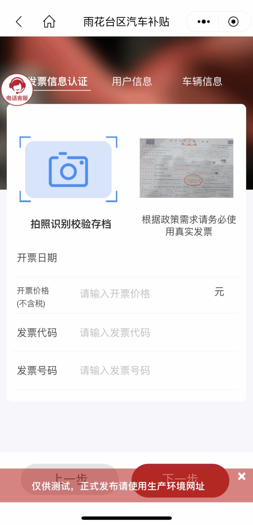 第二步:拍照识别购车发票照片,并核对发票信息,注意核对所有信息的准确性。