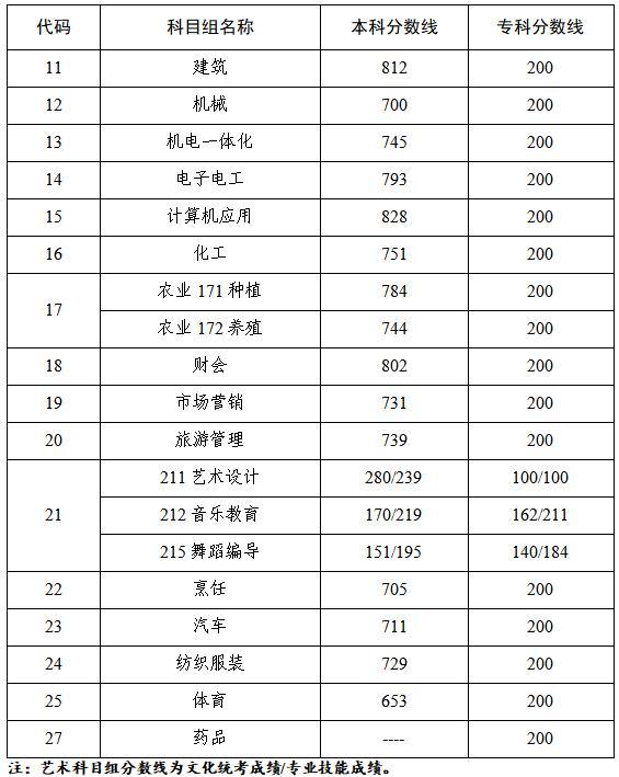省教育考试院根据高校招生计划数、考生志愿和成绩等情况,按科目组分别划定本科、专科第一批次的省录取最低控制分数线。其中,农业和艺术科目组按技能方向划定省录取最低控制分数线。